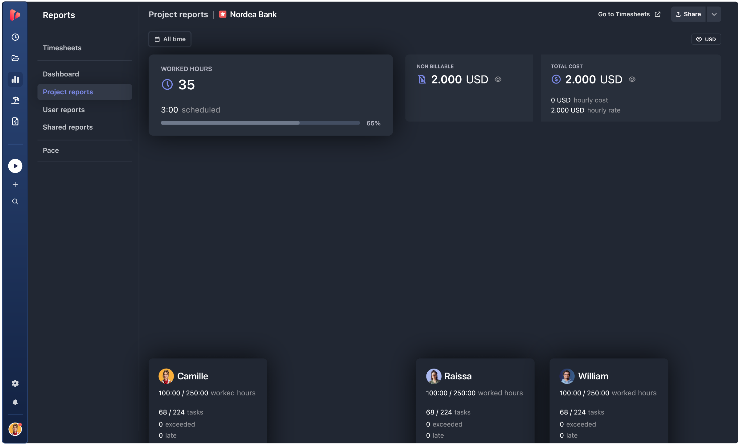 Kluczowe funkcje: Tablice projektowe, śledzenie czasu, zarządzanie zadaniami, automatyczne raporty, integracje z Asana, Trello, Microsoft Teams, Google Kalendarzem i innymi.